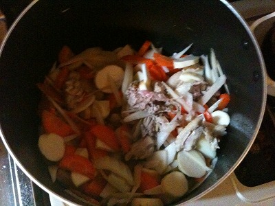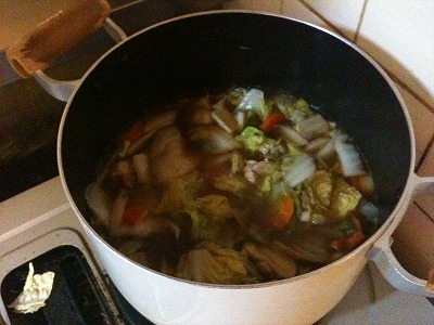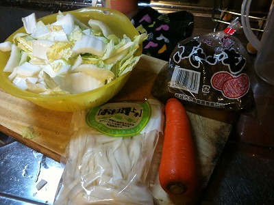 材料は、白菜、にんじん、ごぼう、とりモモなど。ちなみに里芋きらいだけど名物なので入れました。