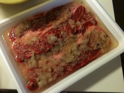 さすがにこれだけじゃ物足りないので近くのスーパーで2枚で500円の驚愕の安さのステーキを購入。これは梨に漬け込んでやわらかくしているところ。