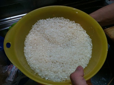 きれいな色をしている米だ。とりあえず研ぐ前に水を45分ほど吸わせる。その後、丁寧かつすばやく研ぎました。ホント見るからにきれいなお米だ。